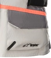 Twee externe waterdichte zakken, grote achterzak, waterdichte borstzakken.