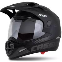 De Cassida Tour 2.0 Dual motorhelm heeft een polycarbonaat helmschaal, kant-en-klare bevestigingen voor het monteren van een communicatorheadset en een op de achterkant gemonteerde MX goggle strap.